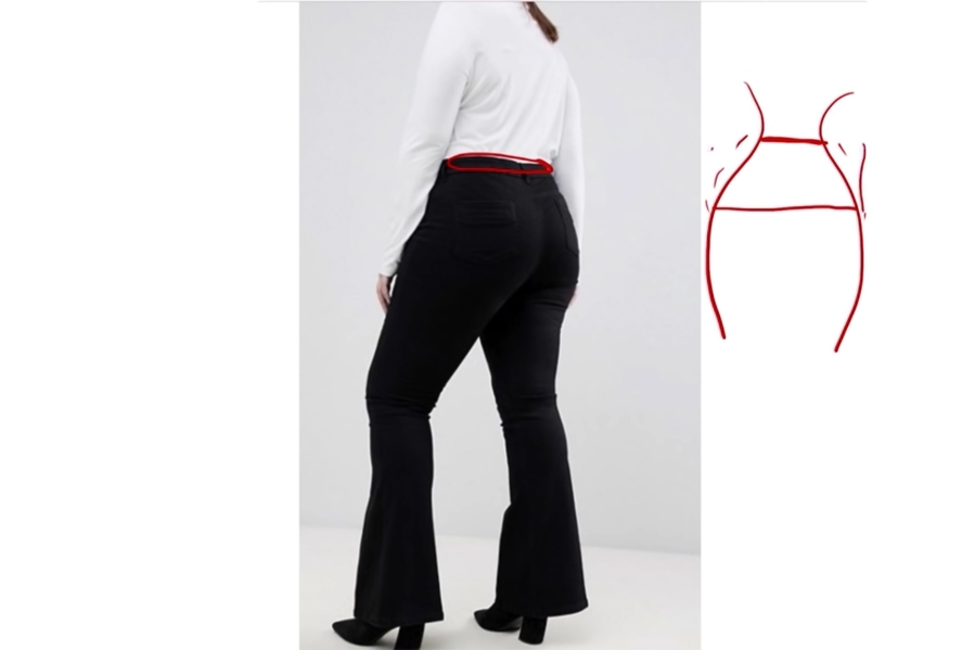 In the below example, you can see the comparison of a straight pair of jeans next to a pair that has a smaller waist.