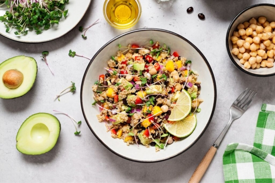 For the recipe, cook 1 cup quinoa and let it cool. In a bowl, mix the quinoa with a drained can of black beans, one diced mango, one diced bell pepper, and ¼ cup chopped red onion. Whisk juice of one lime, 2 tbsp olive oil, salt, and a dash of cumin or chili powder; pour over the mixture and toss. Stir in 2 tbsp chopped cilantro and serve immediately or chill briefly.