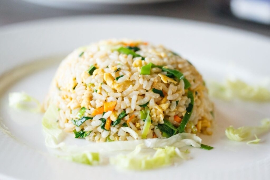 Stir-fry 3 cups chilled cooked brown rice with 2 cups frozen mixed vegetables in 1 tbsp sesame oil. Push to the side and scramble two eggs. Add 1 tablespoon of low-sodium soy sauce and grated fresh ginger to the mix and mix everything together.