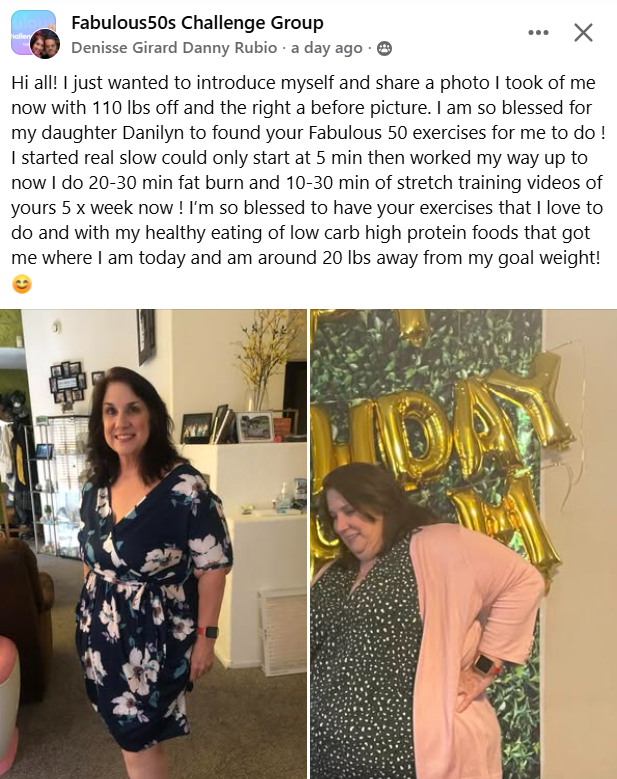 Exercise had never been part of Denisse’s routine. “I hated it,” she said. But her daughter, Danilyn, encouraged her to try Fabulous50s workouts on YouTube. “She told me, ‘Mom, go at your own pace.’ So I did. I couldn’t even do five minutes at first, but now I do 15 to 30 minutes of fat burn five days a week and strength training four times a week.”
