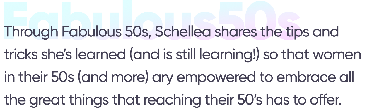 Through Fabulous 50s, Schellea shares the tips and tricks she’s learned (and is still learning!) so that women in their 50s (and beyond) are empowered to embrace all the great things that reaching their 50s has to offer.