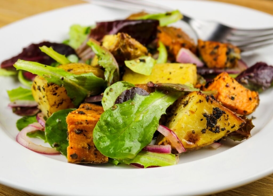 It’s a healthy dish combining the natural sweetness of roasted sweet potatoes with a variety of fresh ingredients, including herbs, greens, and vegetables.
