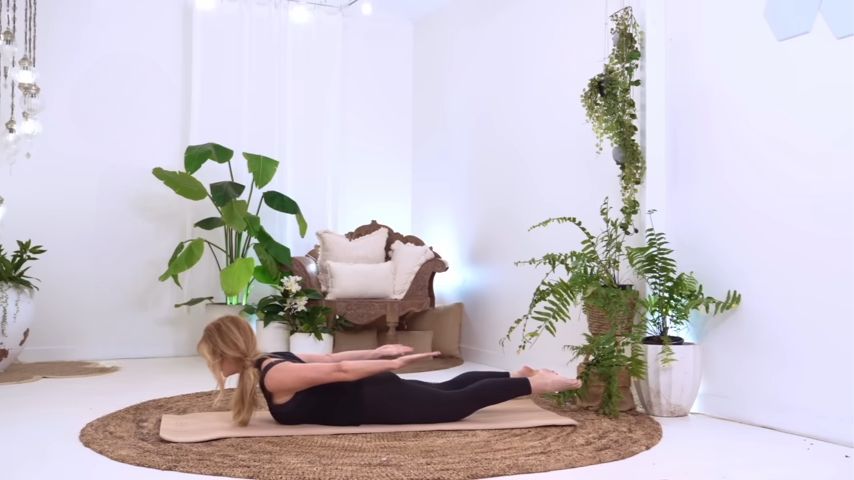 Lie on your stomach and lift your chest, arms, and legs off the floor at the same time. Hold for six seconds, then slowly lower.