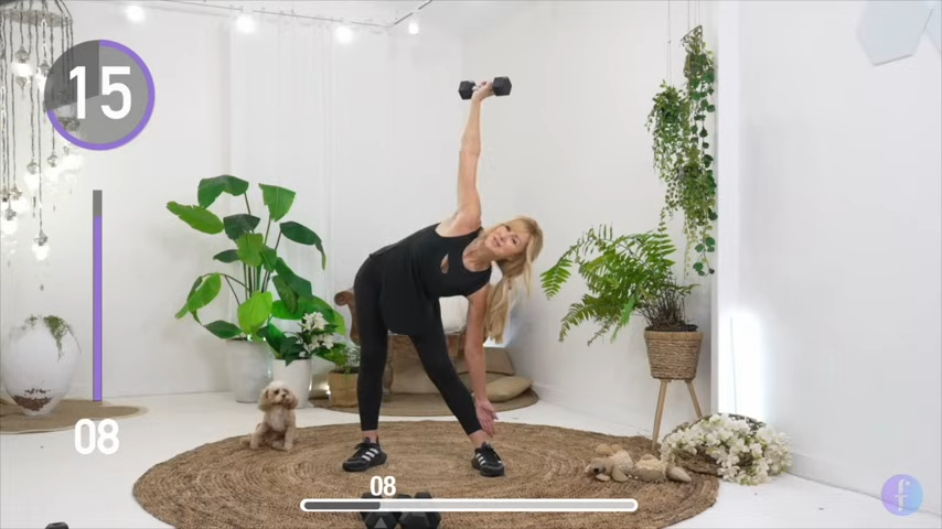 Holding the dumbbell overhead, lean to the side to crunch your obliques. This move lengthens one side of your waist while strengthening the other, giving your midsection a more defined and sculpted appearance.