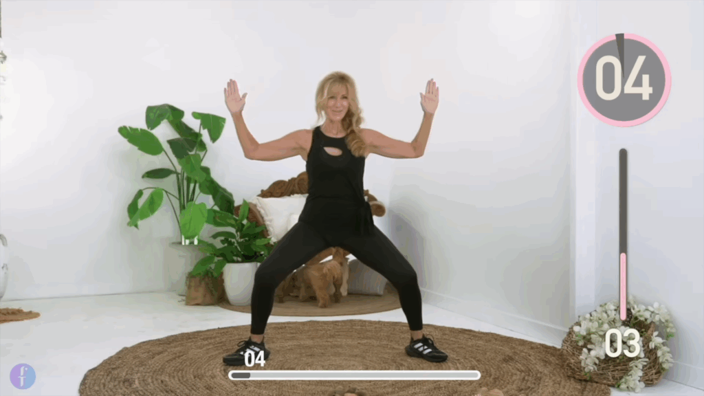 You’ll move through a 10-minute standing ab sequence to target the waist and “muffin top,” a 30-minute fat-burning cardio block to raise your heart rate safely, and a 10-minute balance finisher to support healthy aging and reduce fall risk.
