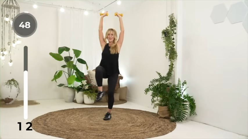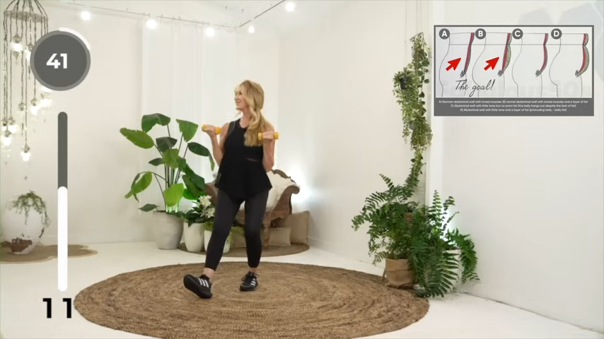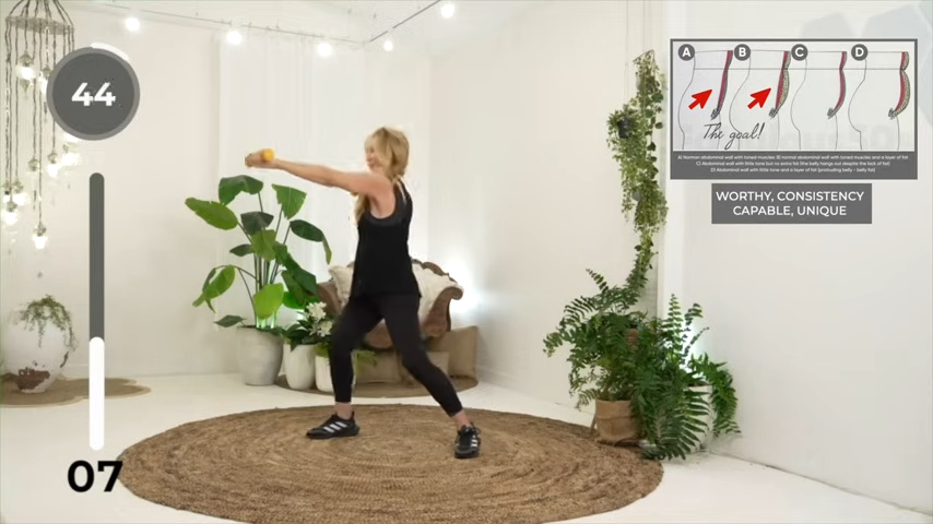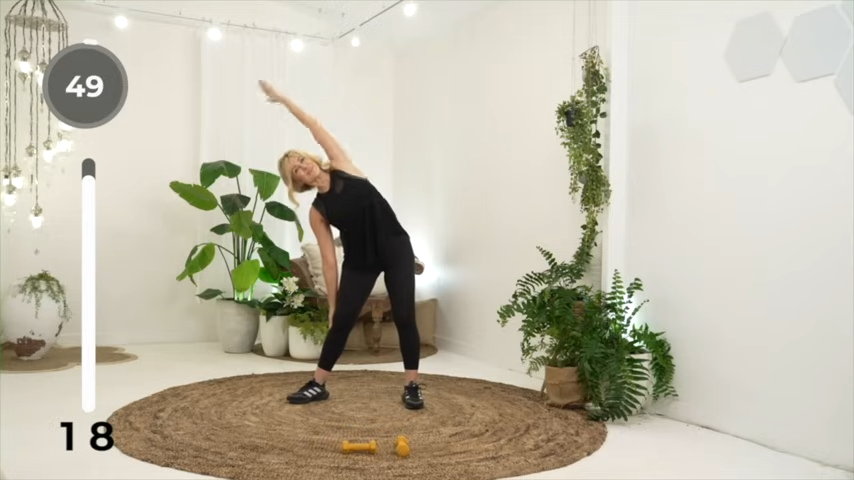 Today’s routine is a fun-but challenging standing ab workout over 50 with 20 exercises, done 50 seconds on with a 10-second walking break. You can use light dumbbells (the workout uses 1 kg), but they’re totally optional especially if you’re brand new.