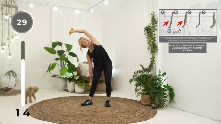 This standing ab workout focuses on strengthening the abdominal wall so it can better support your posture and midsection. When your core is toned, your belly can look firmer and more lifted because the muscles underneath are doing their job, like a supportive “belt” around your waist.
