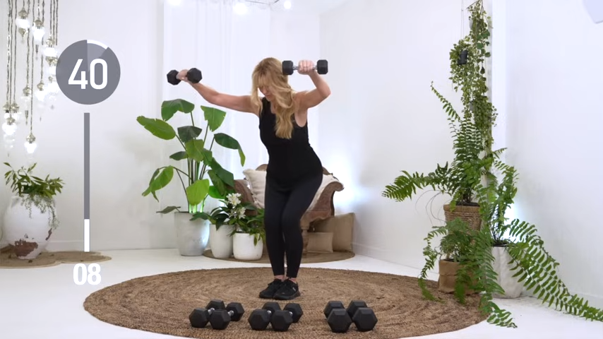 This routine is designed specifically for women over 50. You’ll cycle through three rounds of seven exercises (45 seconds on, 15 seconds rest), plus a gentle warm-up and cool down. Choose a weight that actually challenges you—if 8 reps feel easy, go heavier. That’s how you build muscle at home safely and effectively.