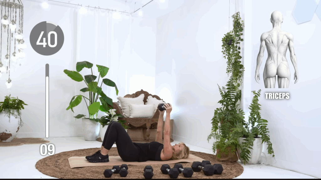 Lie on your back, bend your elbows, and press dumbbells upward. This movement isolates the triceps and strengthens the back of your arms.