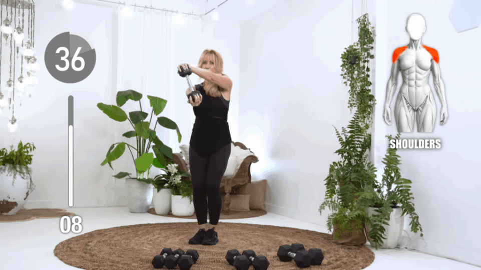 Using light dumbbells, start with arms by your side, then lift outward and continue overhead. This full range of motion builds flexibility and strength while keeping your shoulders mobile.