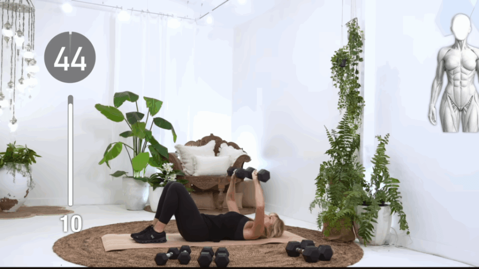 Lie on your back, bend your elbows, and press dumbbells upward. This movement isolates the triceps and strengthens the back of your arms.